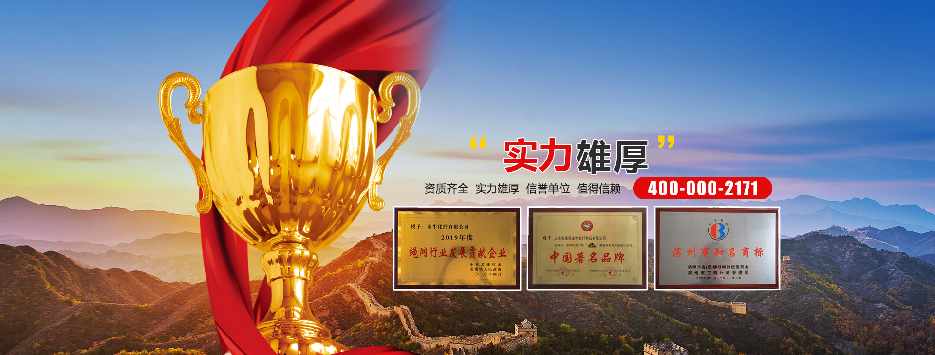 山東省惠民金牛化纖制品有限公司成立于一九九九年,座落于物華天寶、人杰地靈的魯北平原、孫子故里(位于濟南至濱州220國道中段)。濟東高速惠民姜樓出口。       姜樓鎮生產繩網已有三百年的歷史,被譽為“繩網之都”。本公司交通便利,經濟發展迅速,繩、網、安全帶、安全帽及化纖制品規格齊全,公司連續10年被國家指定為特種勞動防護用品定點生產企業。用戶滿意勞動防護用品生產企業。       公司生產流程:從抽絲,捻線,制繩,織網,織帶,注塑,成品。       公司現有職工125人,總占地6000平方米,其中廠房占地面積5000平方米,擁有固定資產2000多萬元。密目網10臺套,捻線機3臺,大型噴絲機3臺,織帶機13臺,全自動大型縫紉機15臺,合繩機5臺。大型注塑機2臺,有節單鉤織網機4臺,大型染色機1臺。主要生產安全網、密目式安全立網、安全帶、安全帽、高強絲及各種防護網、丙綸線、施工線、安全繩、汽車網、火車、異形網等。產品遠銷全國各省、市、自治區,公司產品自投放市場以來深受各級主管部門及建筑施工單位的好評。       公司經營宗旨:“,用戶至上;以質量求生存,...